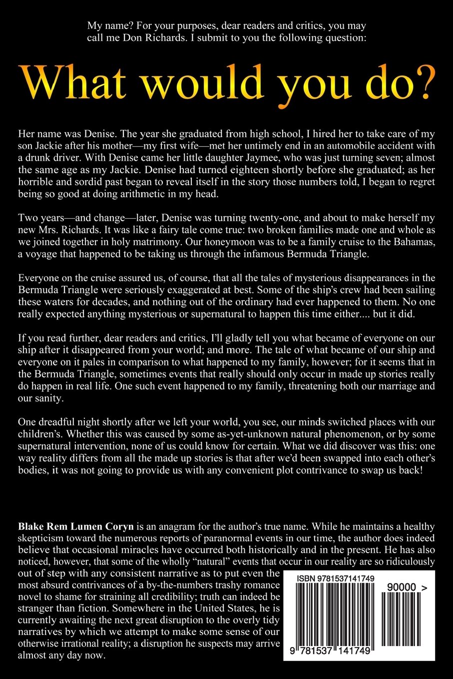 The font? I like it as it is, but if the designer can come up with something that looks better, I’ll replace it in a heartbeat. The background? If the pro designer has a better idea for the background, I’m all ears. Again (for those of you who’ve forgotten what I said in the other sessions), the Bermuda Triangle is just the most visible and readily recognizable symbol for the plot device that swaps the characters. Otherwise, the background has already been demonstrated to be thoroughly disposable.