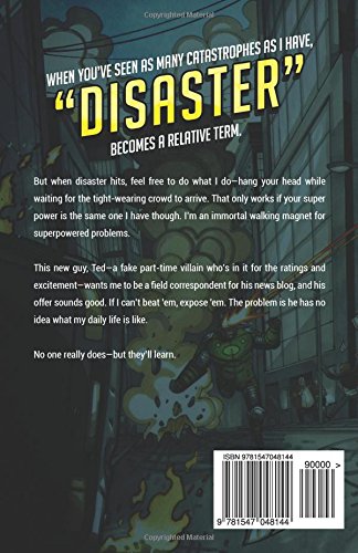 3. Since you’ve got this book published already, I took the liberty of looking up a couple of links to their sales pages and having a look at the free sample previews. In summary, I’d say this is basically the story of a universe with superheroes in it as told from a civilian point of view; sure, the protagonist has the “power” of being a cosmic chew toy who never actually gets killed though he’s seemingly in constant peril, but that doesn’t really make him any less of a civilian. The genre for this, I think, is what’s known as meta-fiction: like John Scalzi’s Redshirts, it gives us the perspective of the lowly “bit part” characters who have to live in one of the crazy universes created by writers of popular schlock such as superhero comic books and space opera television shows, calling into question how much we would like living in some of our popular fantasies if we weren’t the main characters. This book being basically a superhero comic book story told in prose, it’s rather appropriate its cover look something like that of a typical superhero comic book.